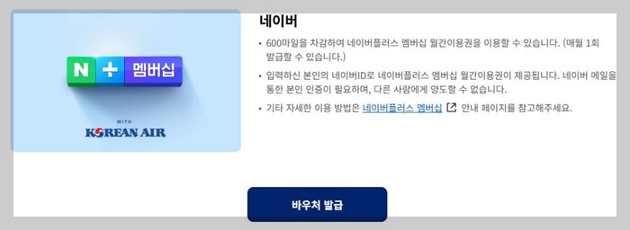 - 600마일을 차감하여 네이버플러스 멤버십 월간이용권을 이용할 수 있습니다. (매월 1회 발급할 수 있습니다.)
