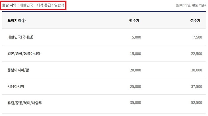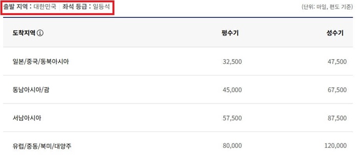 대한항공 마일리지 사용을 위한 항공권 공제표는 출발 지역과 좌석 등급 등에 따라 차등적용 됩니다.