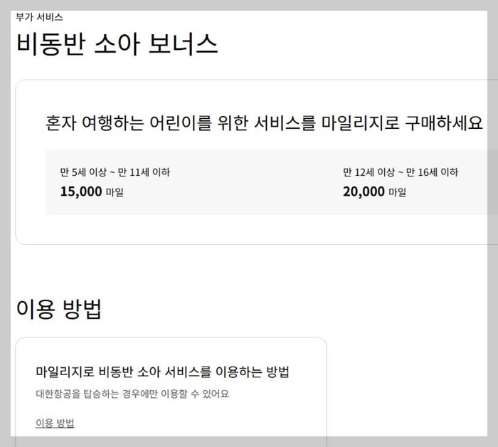 - 혼자 여행하는 어린이를 위한 서비스로 보너스 마일리지로 구매 가능합니다.