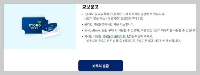 - 1,400마일 차감하여 10,000원 도서 바우처를 발급할 수 있습니다. (1장씩 발급 가능 / 유효기간: 발급일로부터 1달)