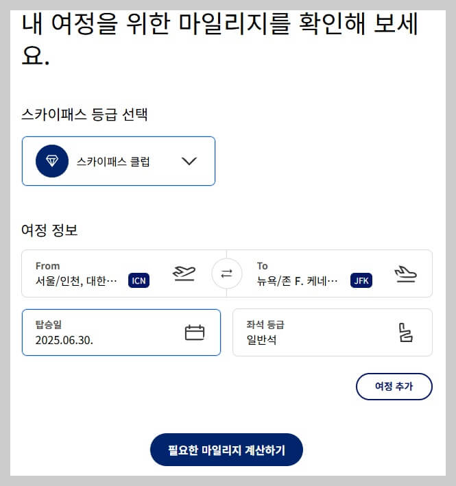' 좌석 업그레이드(승급) 계산하기'를 이용하여 원하는 일정과 회원 등급 선택 후 필요한 마일리지 확인이 가능합니다.