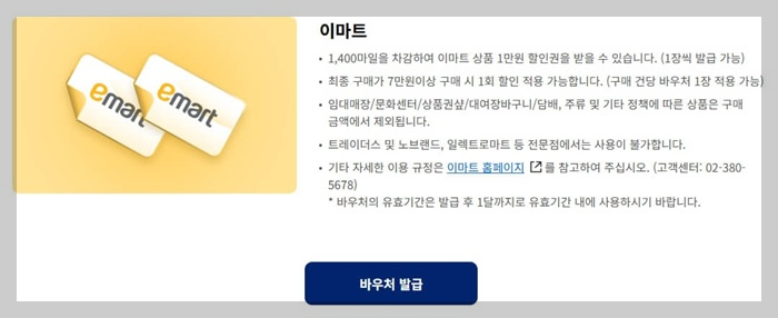 - 61,400마일을 차감하여 이마트 상품 1만원 할인권을 받을 수 있습니다. (1장씩 발급 가능)