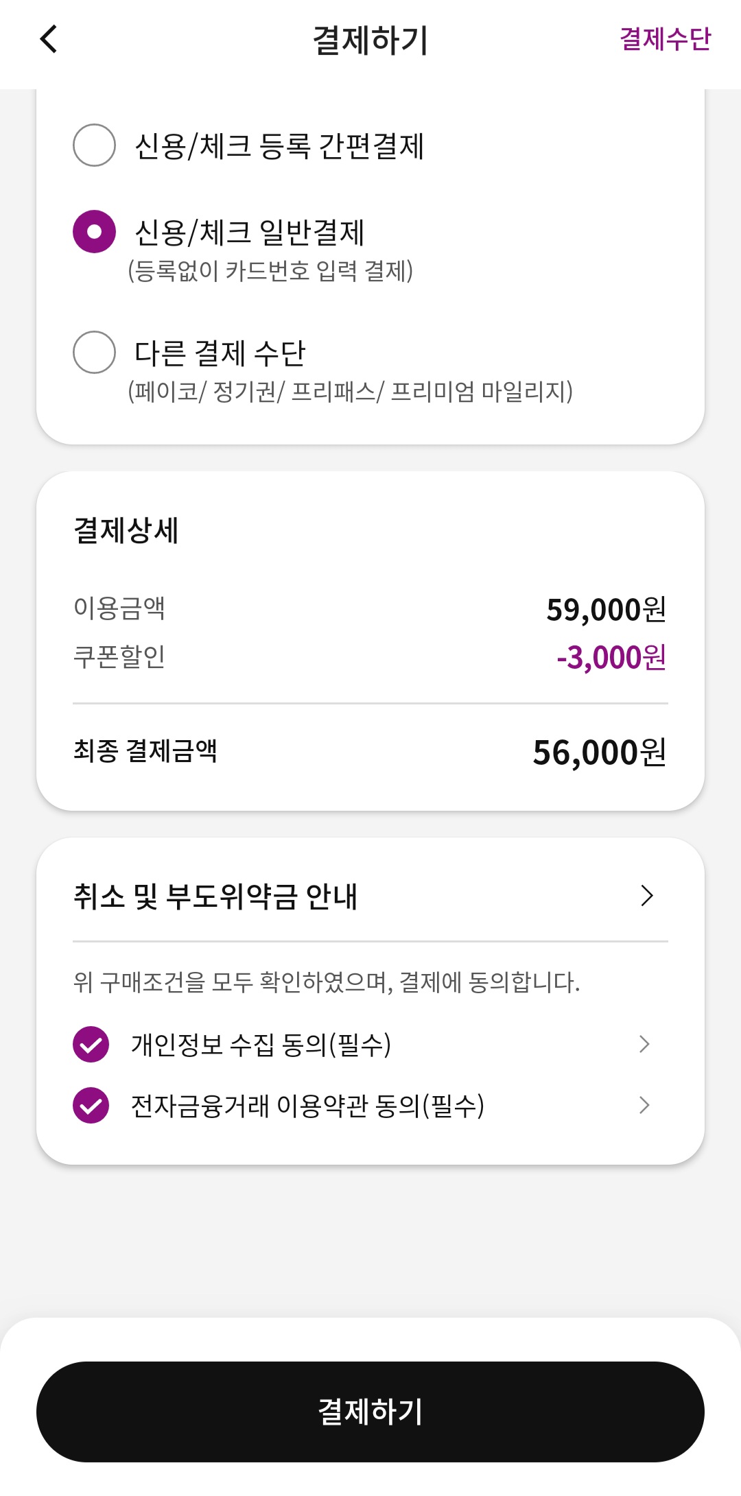 결제 화면에서 원하는 결제 방법을 선택하여 결제를 진행합니다.